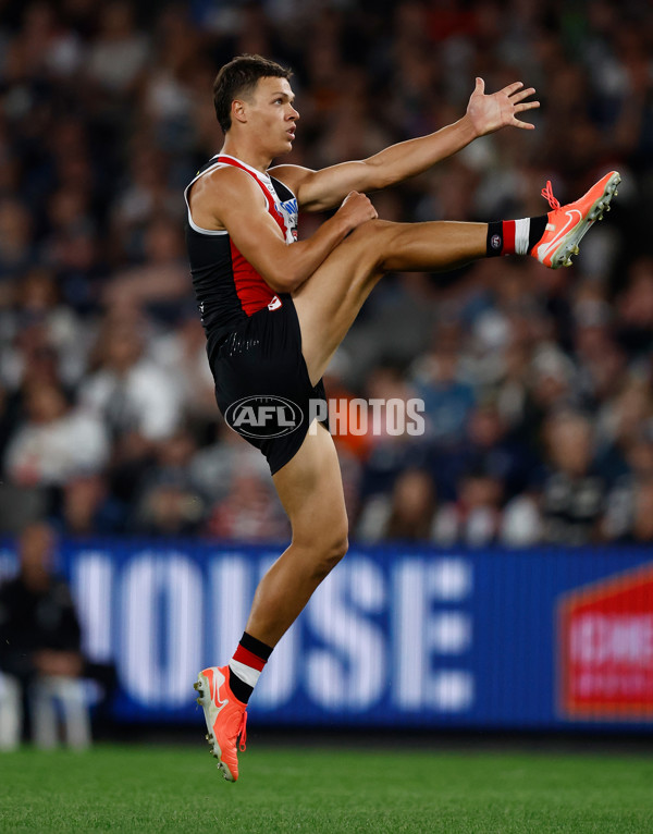 MELBOURNE, AUSTRALIA - MARCH 22: Marcus Windhager of the Saints kicks the ball during the 2025 AFL Round 02 match between the St Kilda Saints and the Geelong Cats at Marvel Stadium on March 22, 2025 in Melbourne, Australia. (Photo by Michael Willson/AFL Photos)