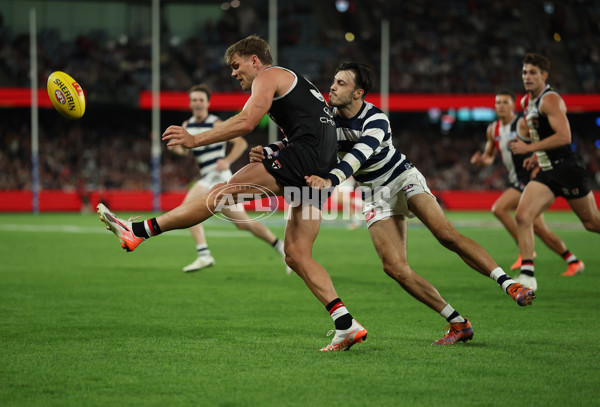 MELBOURNE, AUSTRALIA - MARCH 22: Mason Wood of the Saints kicks the ball during the round two AFL match between St Kilda Saints and Geelong Cats at Marvel Stadium, on March 22, 2025, in Melbourne, Australia. (Photo by Robert Cianflone/Getty Images via AFL Photos)