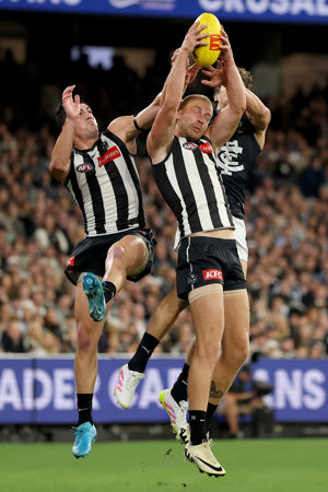 MELBOURNE, AUSTRALIA - APRIL 03: Steele Sidebottom of the Magpies looks to pass the ball during the round four AFL match between Collingwood Magpies and Carlton Blues at Melbourne Cricket Ground, on April 03, 2025, in Melbourne, Australia. (Photo by Robert Cianflone/Getty Images via AFL Photos)