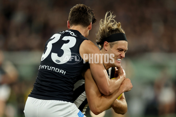 MELBOURNE, AUSTRALIA - APRIL 03: Darcy Moore of the Magpies is tackled by Lewis Young of the Blues during the round four AFL match between Collingwood Magpies and Carlton Blues at Melbourne Cricket Ground, on April 03, 2025, in Melbourne, Australia. (Photo by Robert Cianflone/Getty Images via AFL Photos)