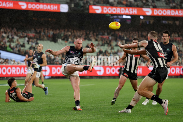 MELBOURNE, AUSTRALIA - APRIL 03: Sam Docherty of the Blues kicks during the round four AFL match between Collingwood Magpies and Carlton Blues at Melbourne Cricket Ground, on April 03, 2025, in Melbourne, Australia. (Photo by Robert Cianflone/Getty Images via AFL Photos)