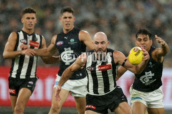 MELBOURNE, AUSTRALIA - APRIL 03: Steele Sidebottom of the Magpies gathers the ball during the round four AFL match between Collingwood Magpies and Carlton Blues at Melbourne Cricket Ground, on April 03, 2025, in Melbourne, Australia. (Photo by Robert Cianflone/Getty Images via AFL Photos)