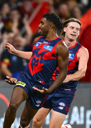ADELAIDE, AUSTRALIA - APRIL 12: Ben Hobbs of the Bombers kicks a goal during the 2025 AFL Round 05 match between the Melbourne Demons and the Essendon Bombers at Adelaide Oval on April 12, 2025 in Adelaide, Australia. (Photo by Michael Willson/AFL Photos)