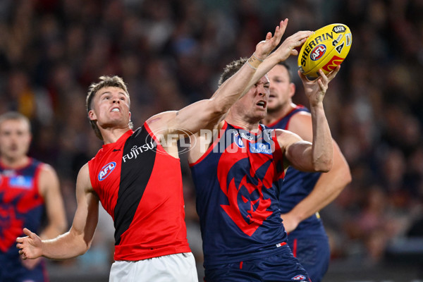 ADELAIDE, AUSTRALIA - APRIL 12: Tom McDonald of the Demons marks the ball during the round five AFL match between Melbourne Demons and Essendon Bombers at Adelaide Oval, on April 12, 2025, in Adelaide, Australia. (Photo by Quinn Rooney/Getty Images via AFL Photos)