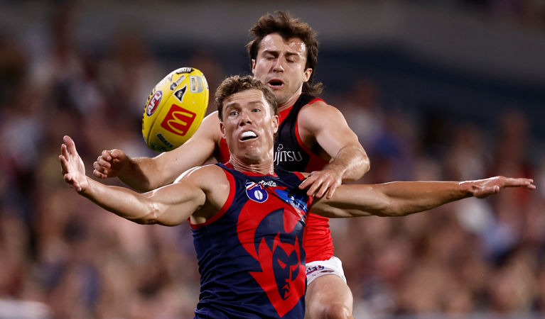 ADELAIDE, AUSTRALIA - APRIL 12: Jack Viney of the Demons kicks the ball during the round five AFL match between Melbourne Demons and Essendon Bombers at Adelaide Oval, on April 12, 2025, in Adelaide, Australia. (Photo by Quinn Rooney/Getty Images via AFL Photos)