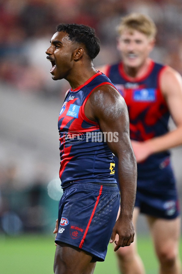 ADELAIDE, AUSTRALIA - APRIL 12: Kysaiah Pickett of the Demons celebrates kicking a goal during the round five AFL match between Melbourne Demons and Essendon Bombers at Adelaide Oval, on April 12, 2025, in Adelaide, Australia. (Photo by Quinn Rooney/Getty Images via AFL Photos)