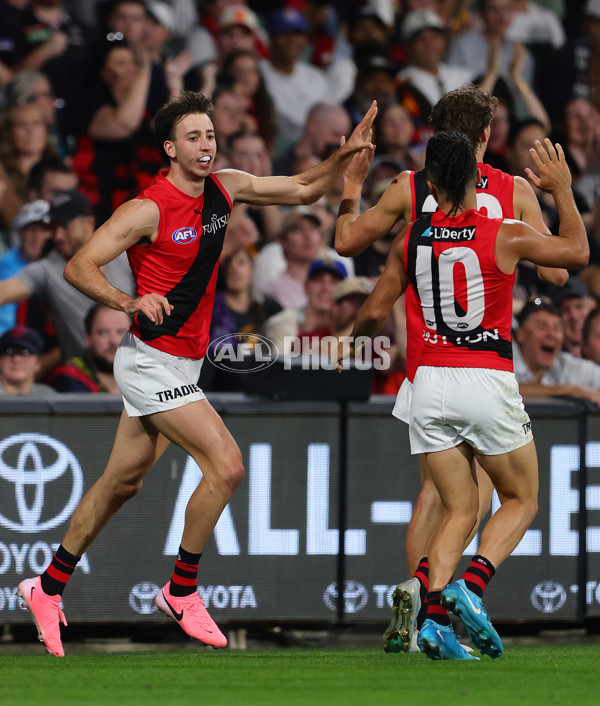 ADELAIDE, AUSTRALIA - APRIL 12: Nic Martin of the Bombers celebrates a goal during the 2025 AFL Round 05 match between the Melbourne Demons and the Essendon Bombers at Adelaide Oval on April 12, 2025 in Adelaide, Australia. (Photo by Sarah Reed/AFL Photos)