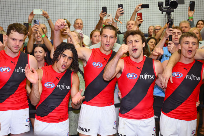 ADELAIDE, AUSTRALIA - APRIL 12: Essendon players celebrate winning in the rooms during the round five AFL match between Melbourne Demons and Essendon Bombers at Adelaide Oval, on April 12, 2025, in Adelaide, Australia. (Photo by Quinn Rooney/Getty Images via AFL Photos)