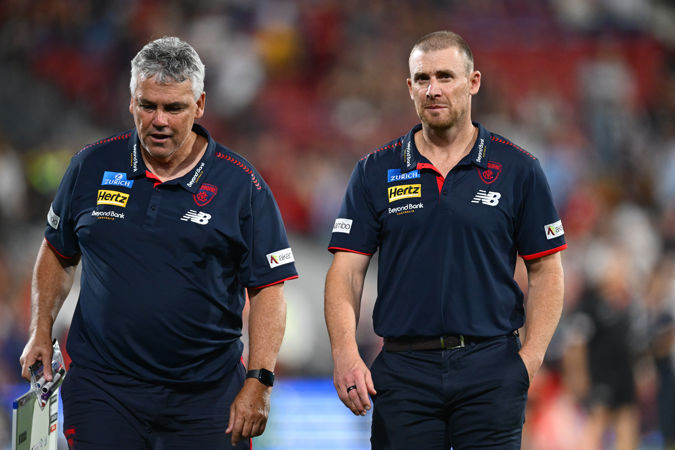 ADELAIDE, AUSTRALIA - APRIL 12: Simon Goodwin, Senior Coach of the Demons looks dejected after a loss during the 2025 AFL Round 05 match between the Melbourne Demons and the Essendon Bombers at Adelaide Oval on April 12, 2025 in Adelaide, Australia. (Photo by Michael Willson/AFL Photos)