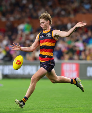 ADELAIDE, AUSTRALIA - APRIL 19: Jake Soligo of the Crows during the 2025 AFL Round 06 match between the Adelaide Crows and the GWS Giants at Adelaide Oval on April 19, 2025 in Adelaide, Australia. (Photo by Sarah Reed/AFL Photos)