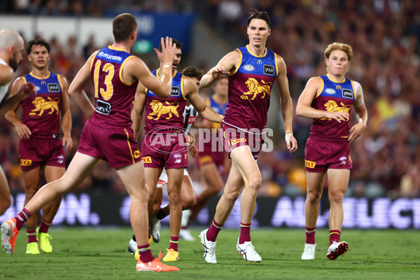 BRISBANE, AUSTRALIA - APRIL 17: Eric Hipwood of the Lions celebrates a goal during the round six AFL match between Brisbane Lions and Collingwood Magpies at The Gabba, on April 17, 2025, in Brisbane, Australia. (Photo by Chris Hyde/AFL Photos)