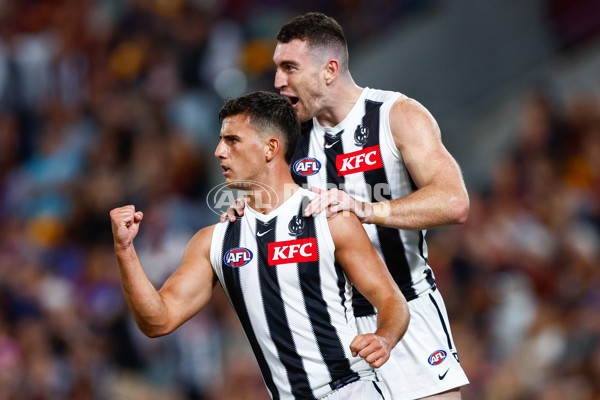 BRISBANE, AUSTRALIA - APRIL 17: Nick Daicos of the Magpies celebrates a goal during the 2025 AFL Round 06 match between the Brisbane Lions and the Collingwood Magpies at The Gabba on April 17, 2025 in Brisbane, Australia. (Photo by Russell Freeman/AFL Photos)