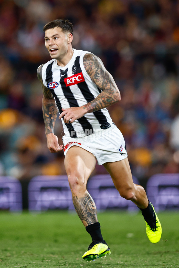 BRISBANE, AUSTRALIA - APRIL 17: Jamie Elliott of the Magpies celebrates a goal during the 2025 AFL Round 06 match between the Brisbane Lions and the Collingwood Magpies at The Gabba on April 17, 2025 in Brisbane, Australia. (Photo by Russell Freeman/AFL Photos)