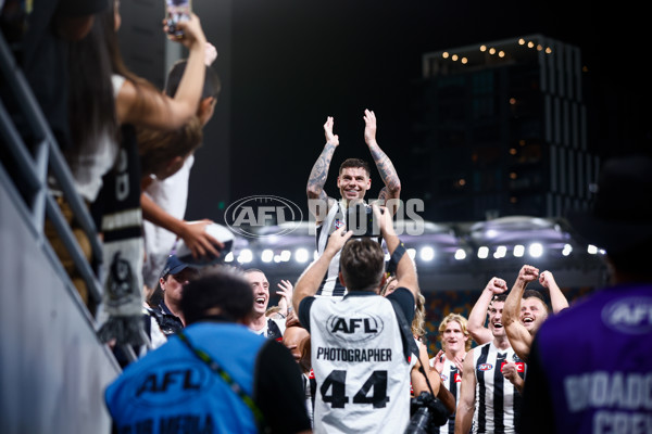 BRISBANE, AUSTRALIA - APRIL 17: Jamie Elliott of the Magpies is chaired off after playing his 200th match during the 2025 AFL Round 06 match between the Brisbane Lions and the Collingwood Magpies at The Gabba on April 17, 2025 in Brisbane, Australia. (Photo by Russell Freeman/AFL Photos)