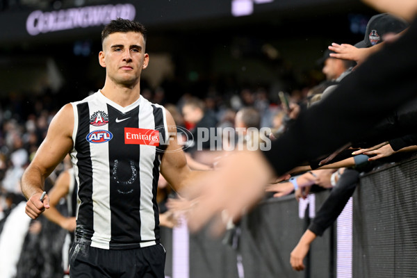 MELBOURNE, AUSTRALIA - APRIL 25: Nick Daicos of the Magpies high fives fans after winning the round seven AFL match between Collingwood Magpies and Essendon Bombers at Melbourne Cricket Ground, on April 25, 2025, in Melbourne, Australia. (Photo by Quinn Rooney/Getty Images via AFL Photos)