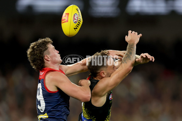 MELBOURNE, AUSTRALIA - APRIL 24: Harvey Langford of the Demons spoils a mark by Rhyan Mansell of the Tigers during the round seven AFL match between Melbourne Demons and Richmond Tigers at Melbourne Cricket Ground, on April 24, 2025, in Melbourne, Australia. (Photo by Robert Cianflone/Getty Images via AFL Photos)