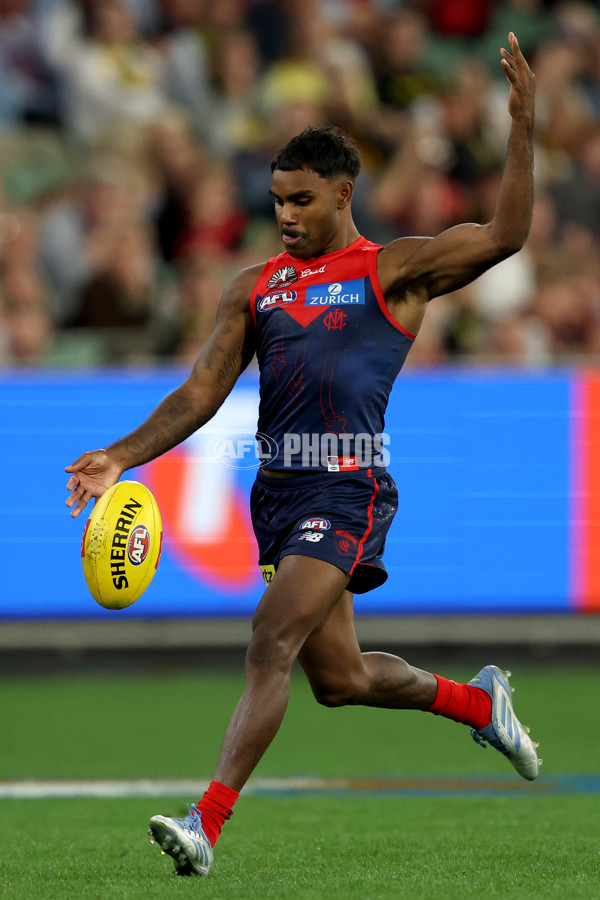 MELBOURNE, AUSTRALIA - APRIL 24: Kysaiah Pickett of the Demons kicks during the round seven AFL match between Melbourne Demons and Richmond Tigers at Melbourne Cricket Ground, on April 24, 2025, in Melbourne, Australia. (Photo by Robert Cianflone/Getty Images via AFL Photos)