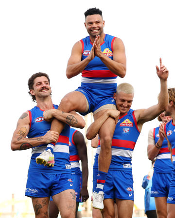 BALLARAT, AUSTRALIA - MAY 03: Jason Johannisen of the Bulldogs is chaired from the ground after playing his 200th game during the round eight AFL match between Western Bulldogs and Port Adelaide Power at Mars Stadium, on May 03, 2025, in Ballarat, Australia. (Photo by Morgan Hancock/Getty Images via AFL Photos)