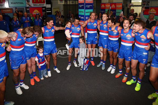 BALLARAT, AUSTRALIA - MAY 03: Bulldogs players sing the song following the round eight AFL match between Western Bulldogs and Port Adelaide Power at Mars Stadium, on May 03, 2025, in Ballarat, Australia. (Photo by Morgan Hancock/Getty Images via AFL Photos)