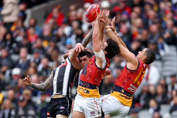 MELBOURNE, AUSTRALIA - MAY 17: Darcy Fogarty of the Crows attempts to mark during the round ten AFL match between Collingwood Magpies and Kuwarna (Adelaide Crows) at Melbourne Cricket Ground, on May 17, 2025, in Melbourne, Australia. (Photo by Josh Chadwick/Getty Images via AFL Photos)