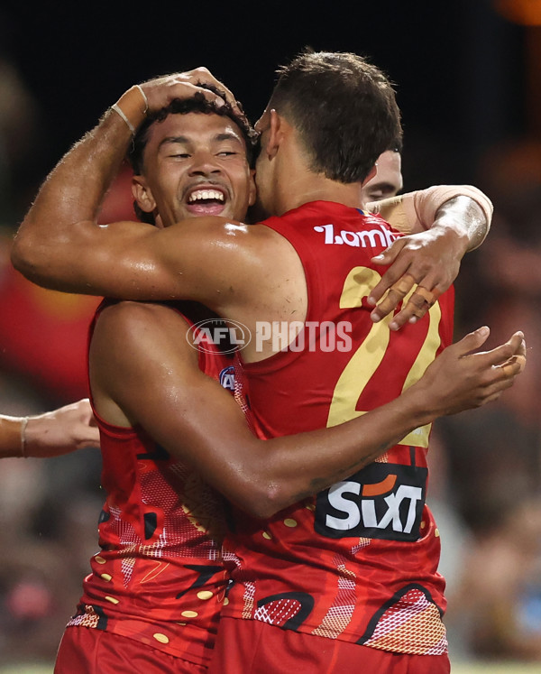 DARWIN, AUSTRALIA - MAY 15: Malcolm Rosas of the Suns celebrates a goal during the 2025 AFL Round 10 match between the Gold Coast Suns and the Hawthorn Hawks at TIO Stadium on May 15, 2025 in Darwin, Australia. (Photo by James Wiltshire/AFL Photos)