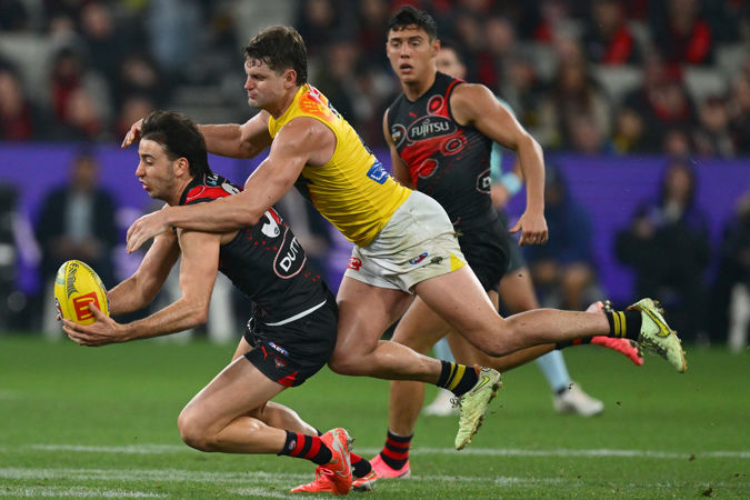 MELBOURNE, AUSTRALIA - MAY 23: Kyle Langford of the Bombers is seen from the bench after being subbed from the match with injury during the 2025 AFL Round 11 match between the Essendon Bombers and the Richmond Tigers at the Melbourne Cricket Ground on May 23, 2025 in Melbourne, Australia. (Photo by Michael Willson/AFL Photos)