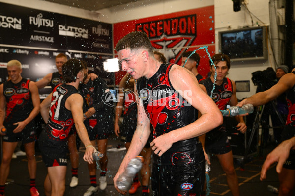 MELBOURNE, AUSTRALIA - MAY 23: Angus Clarke of the Bombers is showered in energy drink by team mates after the round 11 AFL match between Essendon Bombers and Richmond Tigers at Melbourne Cricket Ground, on May 23, 2025, in Melbourne, Australia. (Photo by Quinn Rooney/Getty Images via AFL Photos)