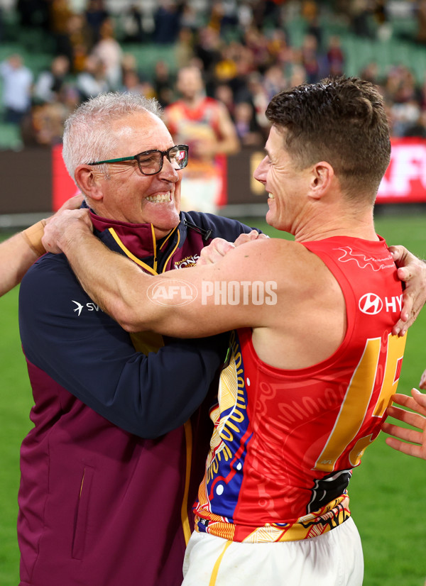 MELBOURNE, AUSTRALIA - MAY 24: Chris Fagan, Senior Coach of the Lions is congratulated by Dayne Zorko after coaching his 200th game during the round 11 AFL match between Hawthorn Hawks and Brisbane Lions at Melbourne Cricket Ground, on May 24, 2025, in Melbourne, Australia. (Photo by Josh Chadwick/AFL Photos)