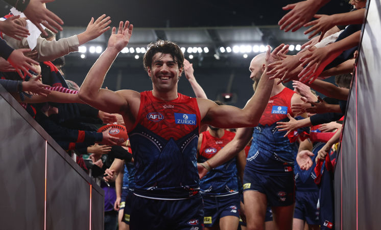 MELBOURNE, AUSTRALIA - MAY 25: Kysaiah Pickett of the Demons acknowledges the fans after the round 11 AFL match between Narrm (Melbourne Demons) and Sydney Swans at Melbourne Cricket Ground, on May 25, 2025, in Melbourne, Australia. (Photo by Quinn Rooney/Getty Images via AFL Photos)
