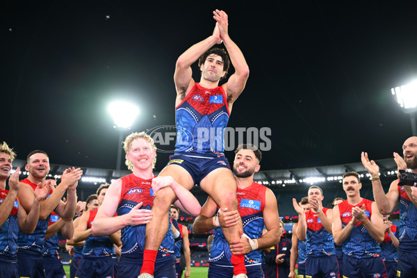 MELBOURNE, AUSTRALIA - MAY 25: Christian Petracca of the Demons is chaired from the ground after playing his 200th match, the round 11 AFL match between Narrm (Melbourne Demons) and Sydney Swans at Melbourne Cricket Ground, on May 25, 2025, in Melbourne, Australia. (Photo by Quinn Rooney/Getty Images via AFL Photos)