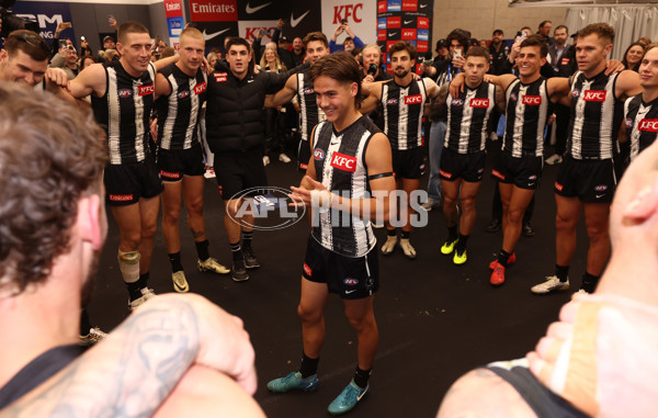 MELBOURNE, AUSTRALIA - MAY 24: William Hayes of the Magpies in the song during the 2025 AFL Round 11 match between the North Melbourne Kangaroos and the Collingwood Magpies at Marvel Stadium on May 24, 2025 in Melbourne, Australia. (Photo by James Wiltshire/AFL Photos)