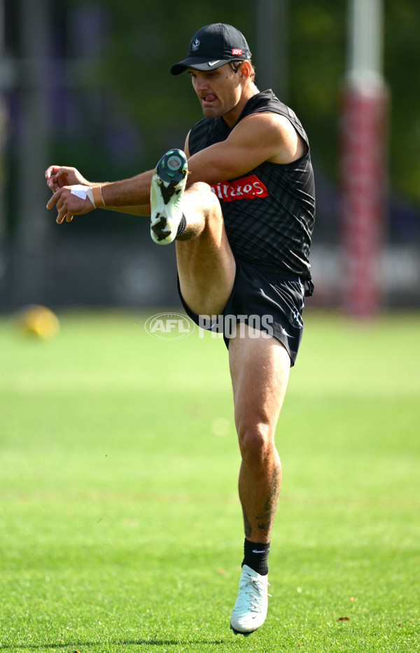 MELBOURNE, AUSTRALIA - MARCH 03: Lachie Schultz of the Magpies kicks during a Collingwood Magpies AFL training session at Olympic Park Oval on March 03, 2025 in Melbourne, Australia. (Photo by Quinn Rooney/Getty Images via AFL Photos)