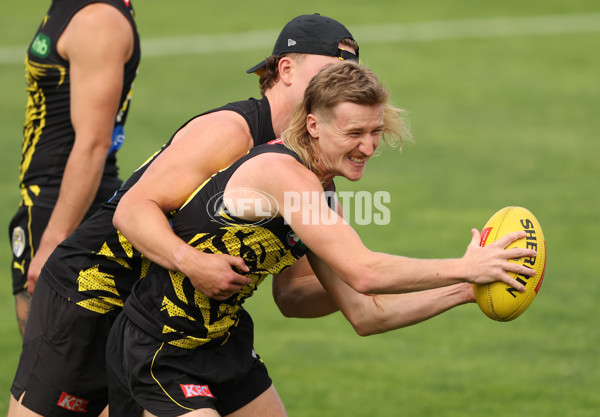 MELBOURNE, AUSTRALIA - APRIL 16: Hugo Ralphsmith of the Tigers takes the ball during a Richmond Tigers AFL training session at Punt Road Oval on April 16, 2025 in Melbourne, Australia. (Photo by Robert Cianflone/Getty Images via AFL Photos)