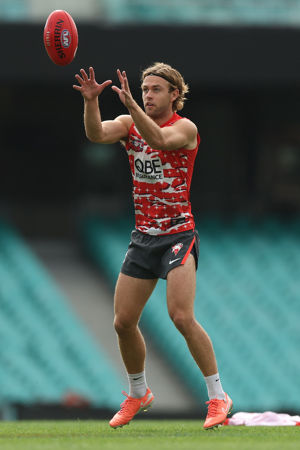 SYDNEY, AUSTRALIA - APRIL 23: Callum Mills of the Swans trains during a Sydney Swans AFL training session at Sydney Cricket Ground on April 23, 2025 in Sydney, Australia. (Photo by Mark Metcalfe/Getty Images via AFL Photos)