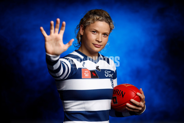 GEELONG, AUSTRALIA - AUGUST 10: Georgie Prespakis of the Cats poses for a photograph during the Geelong Cats AFLW 2023 Official Team Photo Day at GMHBA Stadium on August 10, 2023 in Geelong, Australia. (Photo by Michael Willson/AFL Photos)