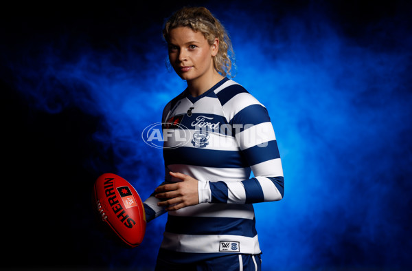 GEELONG, AUSTRALIA - AUGUST 10: Georgie Prespakis of the Cats poses for a photograph during the Geelong Cats AFLW 2023 Official Team Photo Day at GMHBA Stadium on August 10, 2023 in Geelong, Australia. (Photo by Michael Willson/AFL Photos)