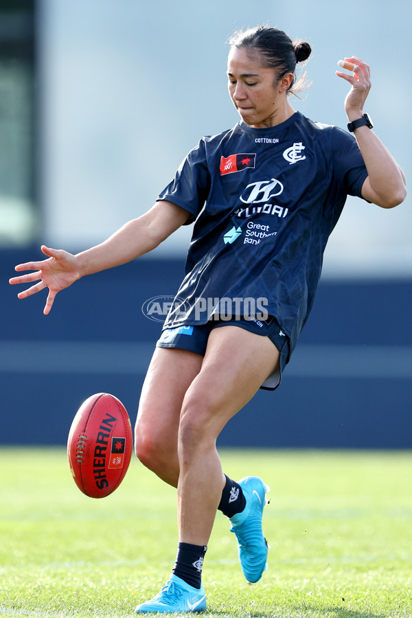 MELBOURNE, AUSTRALIA - AUGUST 09: Darcy Vescio of the Blues warms up prior to the AFLW Match Simulation between Carlton and Melbourne at Ikon Park on August 09, 2024 in Melbourne, Australia. (Photo by Josh Chadwick/AFL Photos)