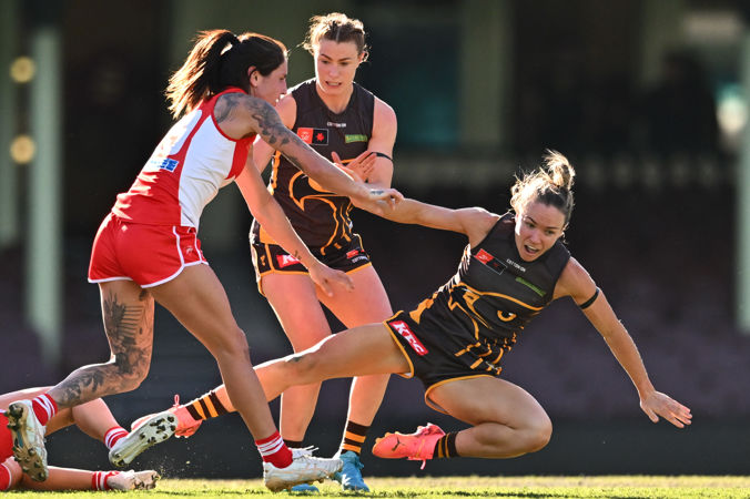 SYDNEY, AUSTRALIA - AUGUST 17: Tanya Kennedy of the Swans and Aileen Gilroy of the Hawks clash during the AFLW practice match between Sydney Swans and Hawthorn Hawks at Sydney Cricket Ground, on August 17, 2024, in Sydney, Australia. (Photo by James Gourley/Getty Images via AFL Photos)