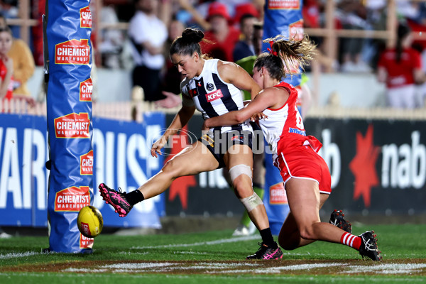 SYDNEY, AUSTRALIA - AUGUST 30: Grace Campbell of the Magpies kicks a goal during the round one AFLW match between Sydney Swans and Collingwood Magpies at North Sydney Oval, on August 30, 2024, in Sydney, Australia. (Photo by Brendon Thorne/AFL Photos)