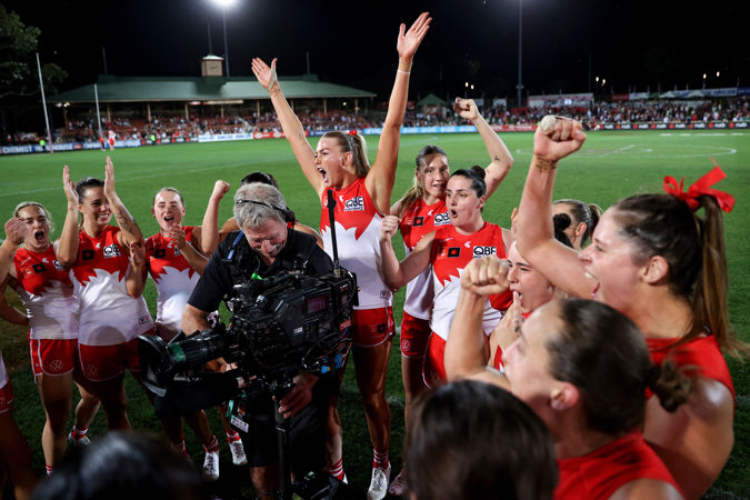 SYDNEY, AUSTRALIA - AUGUST 30: Swans players celebrate at full-time during the round one AFLW match between Sydney Swans and Collingwood Magpies at North Sydney Oval, on August 30, 2024, in Sydney, Australia. (Photo by Brendon Thorne/AFL Photos)