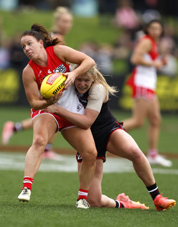 MELBOURNE, AUSTRALIA - SEPTEMBER 08: Serene Watson of the Saints tackles Brooke Lochland of the Swans during the round two AFLW match between St Kilda Saints and Sydney Swans at RSEA Park, on September 08, 2024, in Melbourne, Australia. (Photo by Darrian Traynor/Getty Images via AFL Photos)