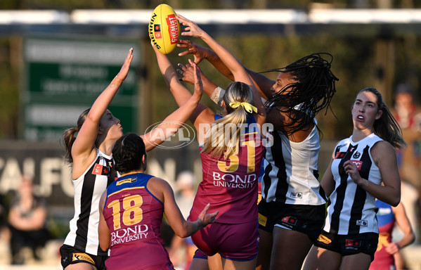 IPSWICH, AUSTRALIA - SEPTEMBER 13: Taylor Smith of the Lions and Sabrina Frederick of the Magpies challenge for the ball during the round three AFLW match between Brisbane Lions and Collingwood Magpies at Brighton Homes Arena, on September 13, 2024, in Ipswich, Australia. (Photo by Bradley Kanaris/Getty Images via AFL Photos)