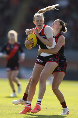 MELBOURNE, AUSTRALIA - SEPTEMBER 15: Brooke Walker of the Bombers tackles Serene Watson of the Saints during the round three AFLW match between Essendon Bombers and St Kilda Saints at Windy Hill, on September 15, 2024, in Melbourne, Australia. (Photo by Darrian Traynor/Getty Images via AFL Photos)