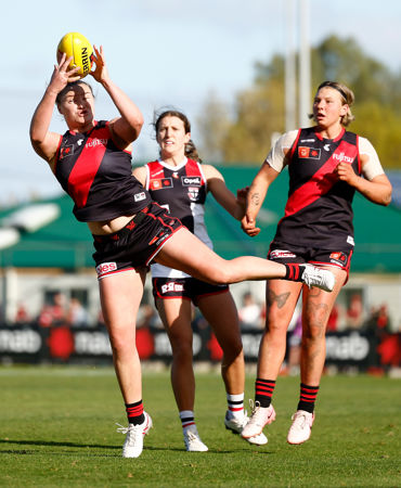 MELBOURNE, AUSTRALIA - SEPTEMBER 15: Emmelie Fiedler of the Saints wins a hit out during the round three AFLW match between Essendon Bombers and St Kilda Saints at Windy Hill, on September 15, 2024, in Melbourne, Australia. (Photo by Darrian Traynor/Getty Images via AFL Photos)