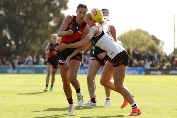 MELBOURNE, AUSTRALIA - SEPTEMBER 15: Olivia Vesely of the Saints is tackled by Maddison Gay of the Bombers during the 2024 AFLW Round 03 match between the Essendon Bombers and the St Kilda Saints at Windy Hill on September 15, 2024 in Melbourne, Australia. (Photo by Michael Willson/AFL Photos)