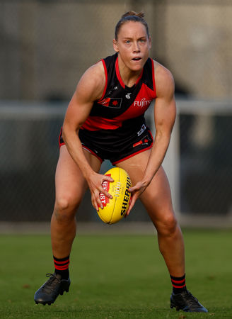 MELBOURNE, AUSTRALIA - SEPTEMBER 15: Jesse Wardlaw (left) and Hannah Priest of the Saints celebrate during the 2024 AFLW Round 03 match between the Essendon Bombers and the St Kilda Saints at Windy Hill on September 15, 2024 in Melbourne, Australia. (Photo by Michael Willson/AFL Photos)