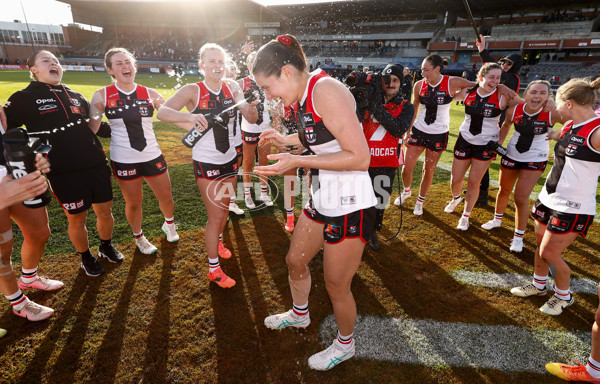 MELBOURNE, AUSTRALIA - SEPTEMBER 15: Emmelie Fiedler of the Saints sings the team song during the 2024 AFLW Round 03 match between the Essendon Bombers and the St Kilda Saints at Windy Hill on September 15, 2024 in Melbourne, Australia. (Photo by Michael Willson/AFL Photos)