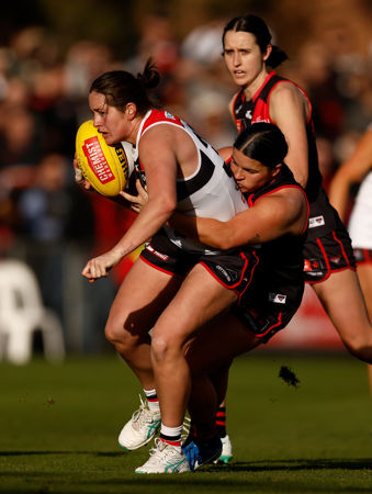 MELBOURNE, AUSTRALIA - SEPTEMBER 15: Stephanie Wales of the Bombers and Rene Caris of the Saints in action during the 2024 AFLW Round 03 match between the Essendon Bombers and the St Kilda Saints at Windy Hill on September 15, 2024 in Melbourne, Australia. (Photo by Michael Willson/AFL Photos)