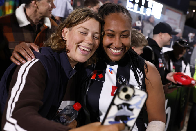 MELBOURNE, AUSTRALIA - SEPTEMBER 17: West Coast Eagles players sing the team song after the round four AFLW match between Collingwood Magpies and West Coast Eagles at Ikon Park, on September 17, 2024, in Melbourne, Australia. (Photo by Darrian Traynor/AFL Photos)