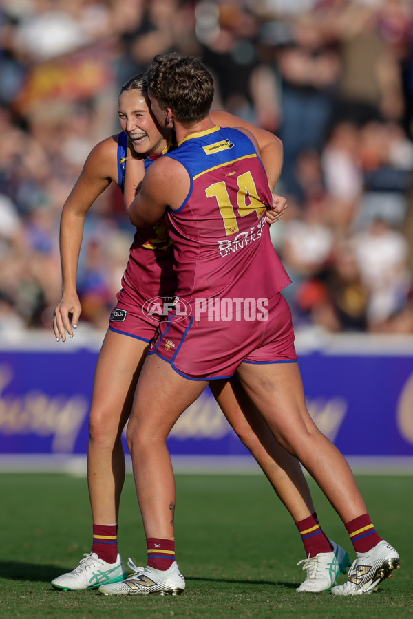 BRISBANE, AUSTRALIA - SEPTEMBER 29: Taylor Smith of the Lions celebrates a goal during the 2024 AFLW Round 05 match between the Brisbane Lions and the Adelaide Crows at Brighton Homes Arena on September 29, 2024 in Ipswich, Australia. (Photo by Russell Freeman/AFL Photos)